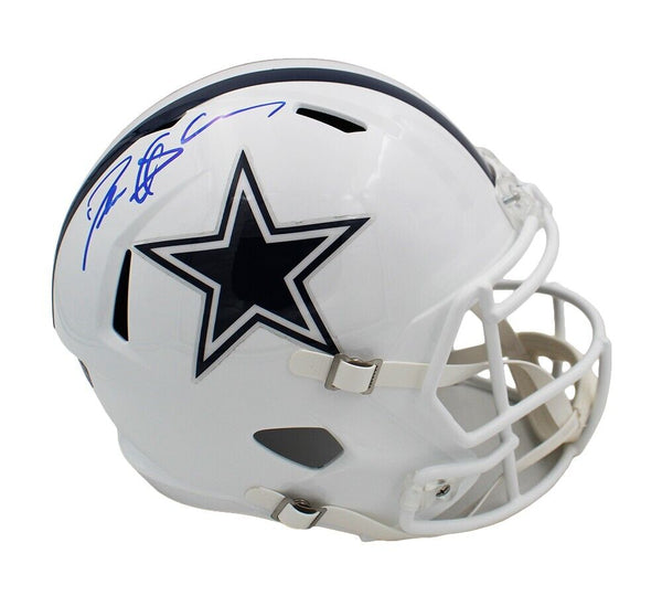 A Dallas Cowboys Speed Replica Alternate White NFL Helmet hand signed by Deion Sanders. The item and signature are in excellent condition. Deion is a 2x Super Bowl Champion, 8x Pro Bowler, in the Atlanta Falcons Ring of Honor and dominated two sports during his career. AUTHENTICATION: Your item has been tagged with a SmarTag powered by Prova Technology, which gives you digital access to your items authentication records, including a proof picture from the signing.