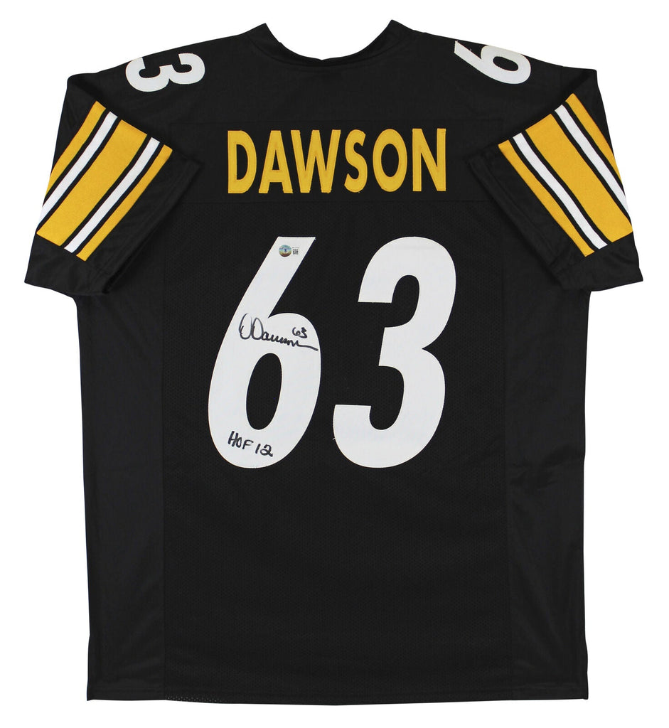 This Autographed Black Pro Style Jersey with the inscription of "HOF 12" has been Personally Signed by Dermontti Dawson of the Pittsburgh Steelers. This item is 100% Authentic to include a Certificate of Authenticity (COA) / hologram by Beckett Authentication Services. This is a BAS Witnessed Protection Program item which means a Beckett Authentication Service representative was present when this item was being signed. This is a stock item. We conducted an autograph signing with Dermontti Dawson and we have several of these available. The one you will receive will be of equal quality to the one pictured. This item can be verified through BAS Witnessed. This is a X-Large sized, non-branded, custom-stitched Jersey.