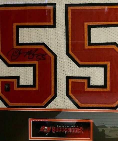 Custom frame measures approximately 35" x 43" in size and features a custom on field style jersey which has been hand-signed in black felt-tip pen by Derrick Brooks.The autograph includes an official Derrick Brooks Player hologram for authenticity purposes. Authentication: Derrick Brooks Player Hologram
