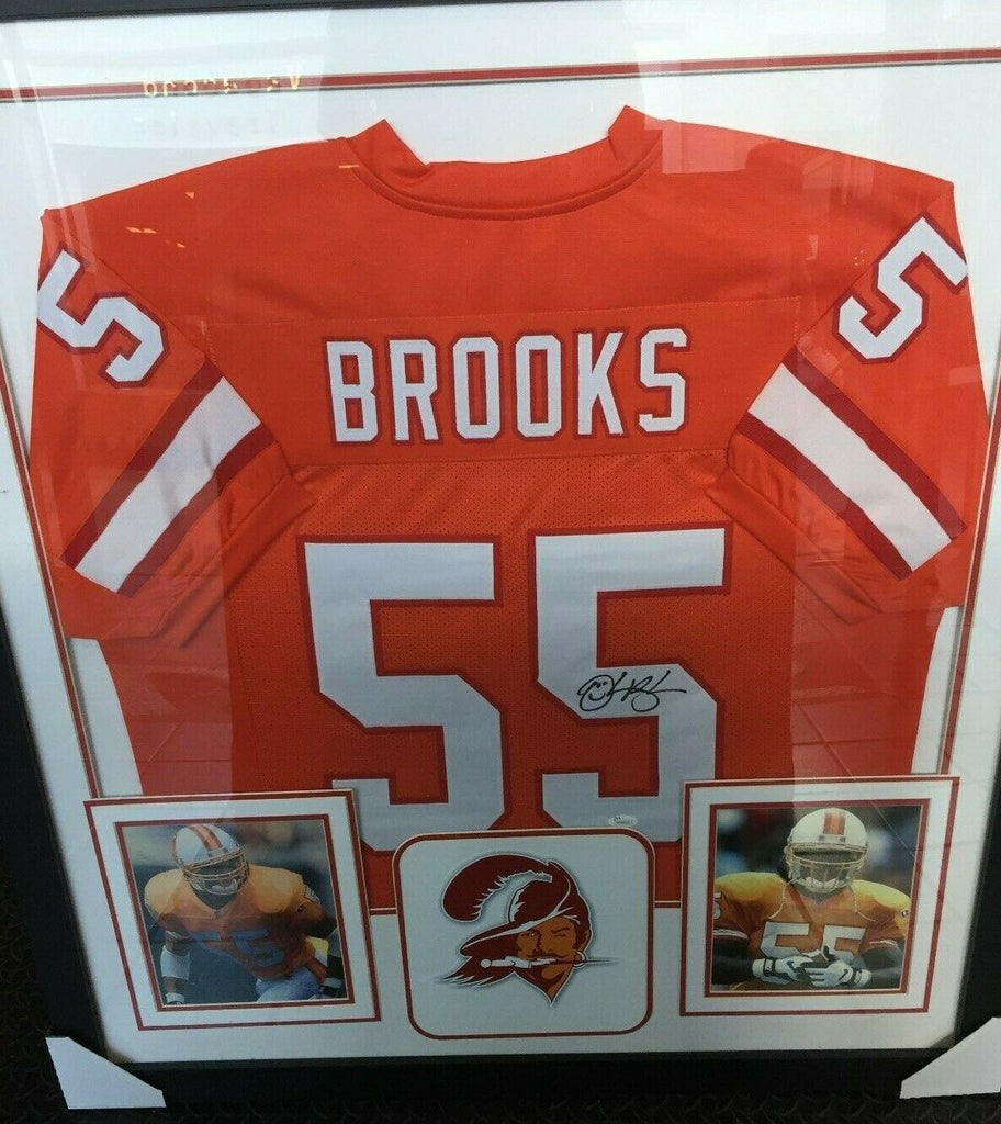 Custom frame measures approximately 36" x 39" in size and features a custom on field style jersey which has been hand-signed in black felt-tip pen by Derrick Brooks.The lot / autograph(s) includes an official James Spence Authentication (JSA) hologram and matching COA for authenticity purposes. The signing of this item was witnessed by JSA.Authentication: JSA COA