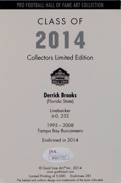 This is a hand autographed Goal Line Art Card of Derrick Brooks of The Tampa Bay Buccaneers. This item has a James Spence Witness Authentication, which comes with a JSA numbered sticker and a matching JSA Certificate of authenticity. You can view this item on the SpenceLOA website. It was signed either at a public autograph appearance or a Private Signing. This is a stock photo of the item. Although you may not receive this exact item, the item you receive is virtually identical and brand new in great shape. This is a hand autographed Goal Line Art Card of Derrick Brooks of The Tampa Bay Buccaneers. This item has a James Spence Witness Authentication, which comes with a JSA numbered sticker and a matching JSA Certificate of authenticity. You can view this item on the SpenceLOA website. It was signed either at a public autograph appearance or a Private Signing. This is a stock photo of the item. Although you may not receive this exact item, the item you receive is virtually identical and brand new in great shape.