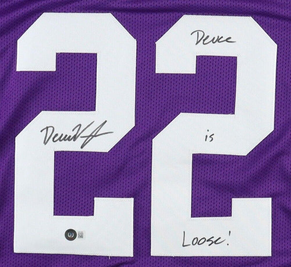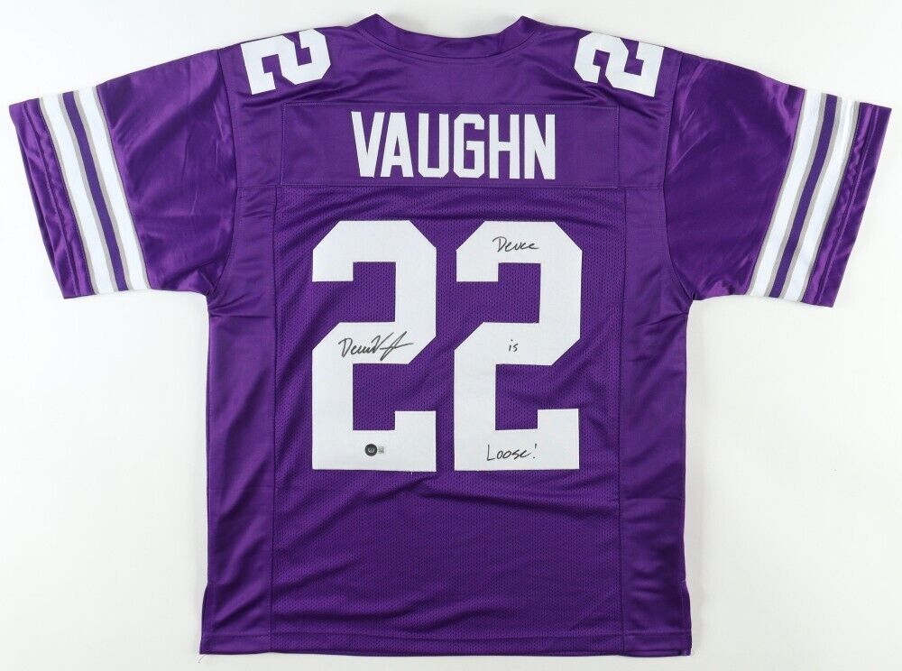 Custom on-field style jersey. Everything is sewn on, size XL. Hand-signed and inscribed by Deuce Vaughn (Dallas Cowboys).The lot / autograph(s) includes an official Beckett Authentication Services serially numbered hologram for authenticity purposes. The signing of this item was witnessed by Beckett.Authentication: Beckett Hologram
