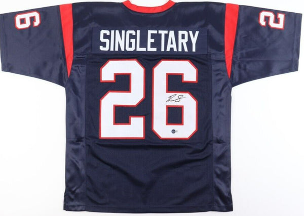 Custom on-field style jersey. Everything is sewn on, size Adult Large. Hand-signed in black felt-tip pen by Devin Singletary. The autograph includes an official Beckett Authentication Services serially numbered hologram for authenticity purposes.Authentication: Beckett Hologram