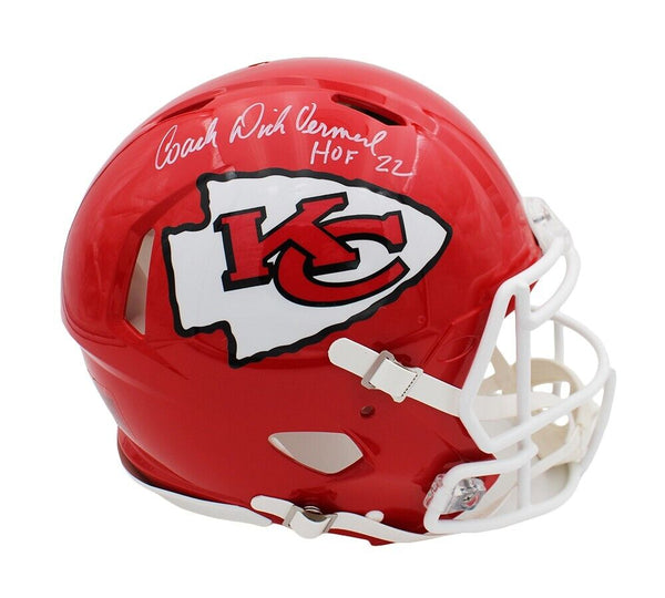 A Kansas City Chiefs Speed Authentic NFL Helmet hand signed by Dick Vermeil. The item and signature are in excellent condition. In addition to signing his name, Dick also inscribed "HOF 2022" on the item. Dick had a very successful Football Coaching career. He lead teams like the Philadelphia Eagles, St. Louis Rams, Kansas City Chiefs, UCLA Bruins with losing records to victory, winning the Rose Bowl, Playoffs & Super Bowls. He has been Coach of the Year several times and was inducted into the Pro Football Hall of Fame in 2022. AUTHENTICATION: The item is accompanied by a Dick Vermeil Exclusive Certificate of Authenticity - Dick Vermeil Exclusive Serial Numbered & Databased Hologram - Picture of Dick from the signing