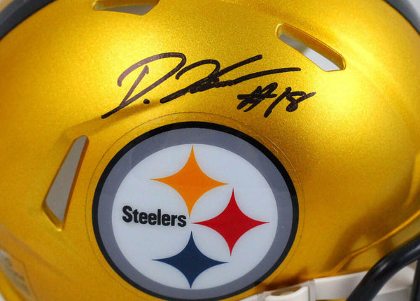 Diontae Johnson Signed Pittsburgh Steelers Flash Speed Mini Helmet-Beckett W Hologram *Black This is a Hand Autographed Helmet of Diontae Johnson of the Pittsburgh Steelers. This is a Riddell Football Flash Speed Mini Helmet. This item has a Beckett Witness Authentication, which comes with a Beckett numbered hologram and a QR code for verification. You can view this item on the Beckett website, it shows when and where the item was signed. It was signed either at a public autograph appearance or a private signing. This is a stock photo of the item. Although you may not receive this exact item, the item you receive is virtually identical and brand new in great shape.