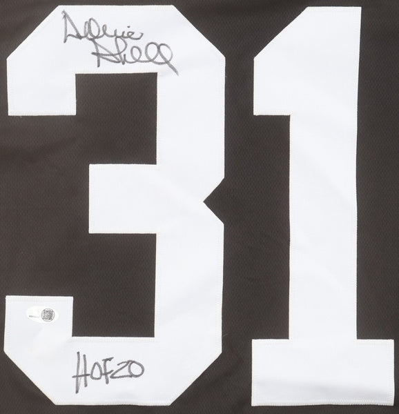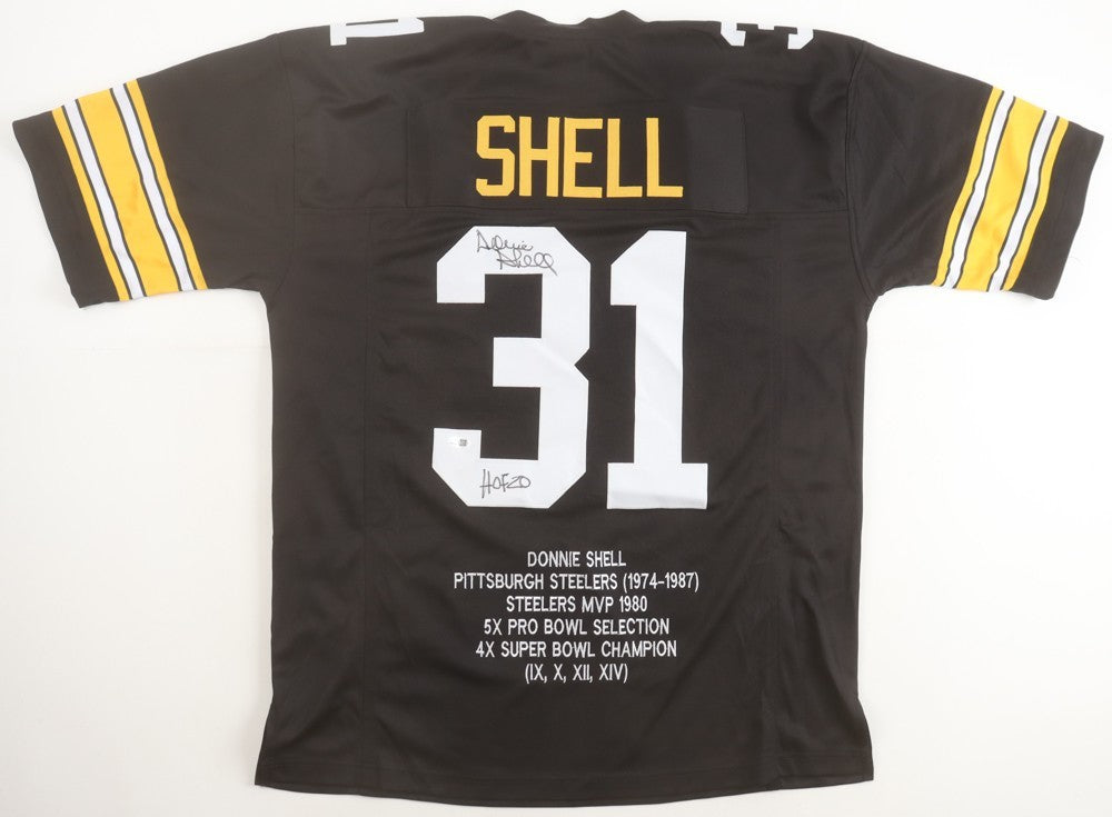 Custom on-field style jersey. Everything sewn on, size XL. Hand-signed and inscribed by Donnie Shell (HOF). Shell's career highlights have been custom stitched onto the back of the jersey below the reverse numbers.The autograph includes an official James Spence Authentication (JSA) scannable hologram and QR Code card for authenticity purposes. The signing of this item was witnessed by JSA.Authentication: JSA Scannable Hologram with QR Code card