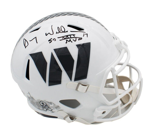A Washington Commanders Speed Replica Salute to Service 3 NFL Helmet hand signed by Doug Williams. The item and signature are in excellent condition. In addition to signing his name, Doug also inscribed "SB XXVI MVP" on the item. Doug is a former quarterback who played for the Tampa Bay Buccaneers and for Washington Football Team. He is a Super Bowl Champion and Super Bowl MVP. AUTHENTICATION: The item has been tagged with a SmarTag powered by Prova Technology, which gives you digital access to the items authentication records, including a proof picture from the signing.