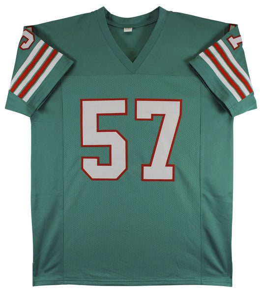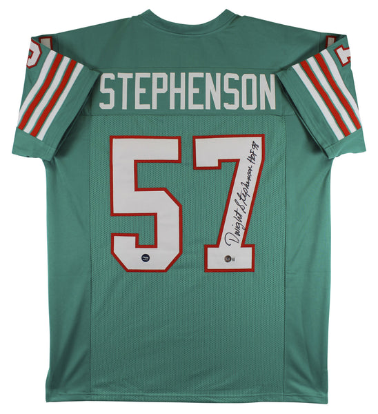 This Autographed Teal Pro Style Jersey with the inscription of "HOF 98" has been Personally Signed by Dwight Stephenson of the Miami Dolphins. This item is 100% Authentic to include a hologram by Beckett Authentication Services. This item may come with the new Beckett Authentication hologram that has a scannable QR code rather than the traditional COA. If you would like to have a COA, you are welcome to reach out to Beckett for a printed certification once you receive your item. This is a BAS Witnessed Protection Program item which means a Beckett Authentication Service representative was present when this item was being signed. We conducted an autograph signing with Dwight Stephenson where multiples of the same item were signed. While the photographs are representative of this item, the size, placement and strength of the signature may vary. Each item is hand signed, therefore, each autograph is unique. This item can be verified through BAS Witnessed. This is a X-Large sized, non-branded, custom-stitched Jersey.