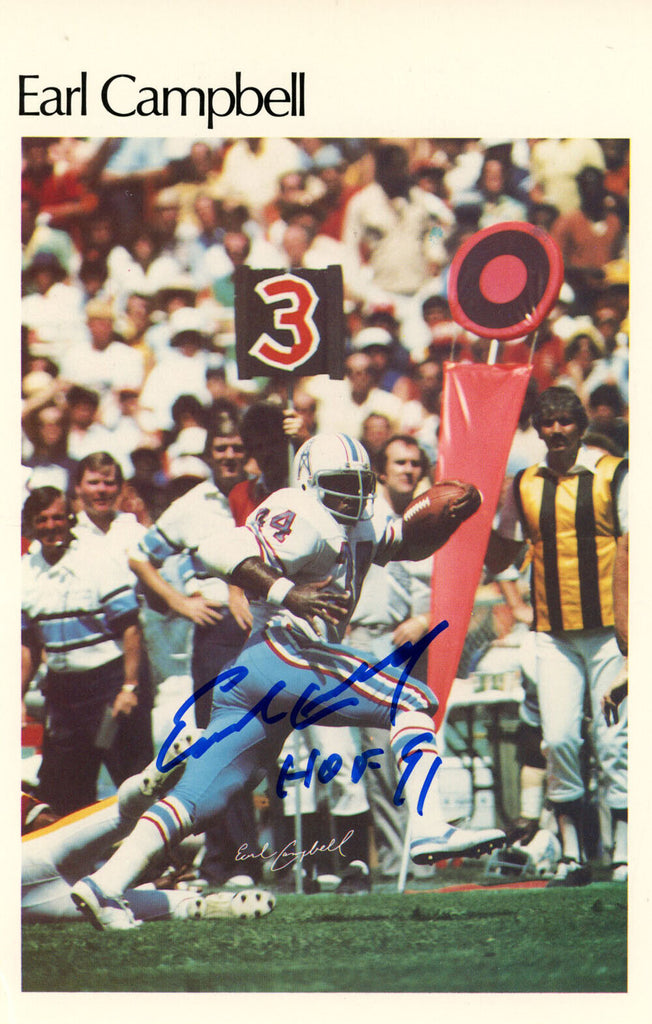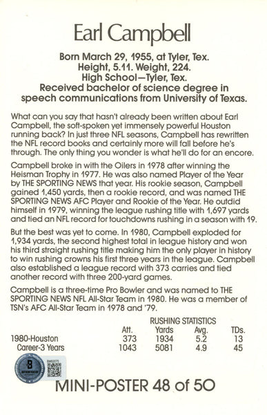 The number in the listing title is just an inventory sku for our records and is not the authentication number. This is a stock photo of the item that you will receive. This is a mini poster measuring 8.5" x 5.5" that was personally autographed by Earl Campbell with HOF inscription. Includes a certificate of authenticity from Beckett Authentication Services (BAS) and Denver Autographs.