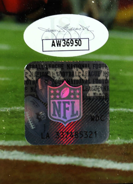 The product is an authentic 8x10 photo signed by football player Emmanuel Sanders, with a plaque included. The autograph is authenticated by James Spence Authentication (JSA), ensuring its legitimacy. This collectible item would be a valuable addition for fans of the Denver Broncos and football memorabilia enthusiasts.