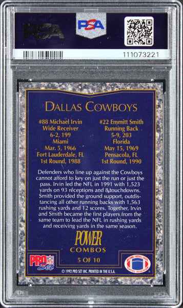 This Autographed Card Graded Mint 9! Auto Graded Gem Mint 10! 1992 Pro Set Power #5 Power Combos Card has been Personally Signed by Emmitt Smith & Michael Irvin of the Dallas Cowboys. This item is 100% Authentic, it comes slabbed and authenticated by PSA/DNA. We have multiples of this same item. While the photographs are representative of this item, the size and placement of the signature may vary. Each item is hand signed, therefore, each autograph is unique.