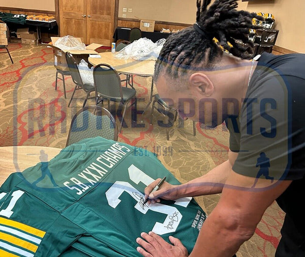 A Green Bay Custom Green Super Bowl Stats Sewn Jersey hand signed by Brett Favre, Andre Rison, Dorsey Leven, Gilbert Brown & Antonio Freeman. The item and signature are in excellent condition. AUTHENTICATION: Your item has been tagged with a SmarTag powered by Prova Technology, which gives you digital access to your items authentication records, including a proof picture from the signing.