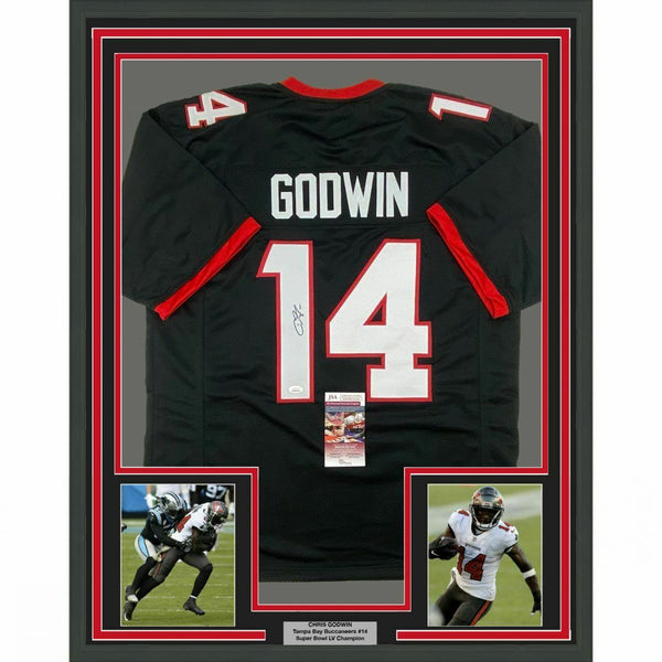 FRAMED Autographed/Signed CHRIS GODWIN 33x42 Tampa Bay Pewter Jersey JSA COA The item is professionally framed & matted with two 8x10 photos, measures 33"x42" and is ready to be hung in your man cave! NOTE: COA card will be mounted on the back of the frame, not inside it on top of the jersey as seen in the picture. Please allow up to 5 business days for the item to be framed, packaged safely, and picked up by UPS. Photo and matting requests can be made.