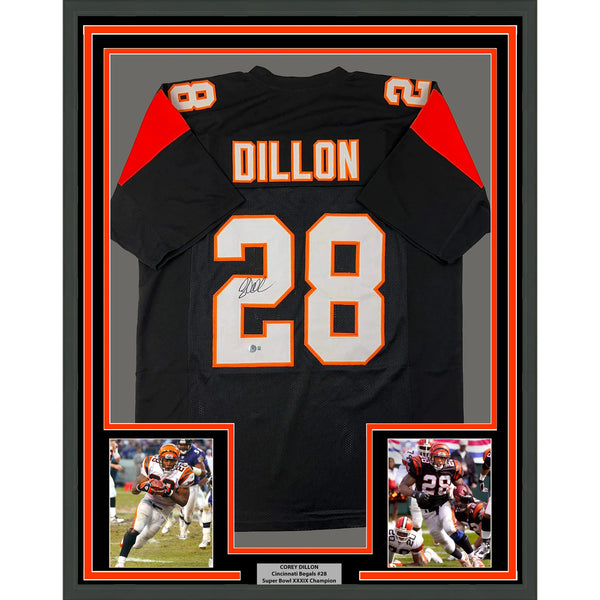 Framed Autographed/Signed Corey Dillon 33x42 Cincinnati Black Jersey BAS COA The item is professionally framed and matted with two 5x7 photos, measures 35 inches by 39 inches and is ready to be hung in your man cave! Photo and matting requests can be made.