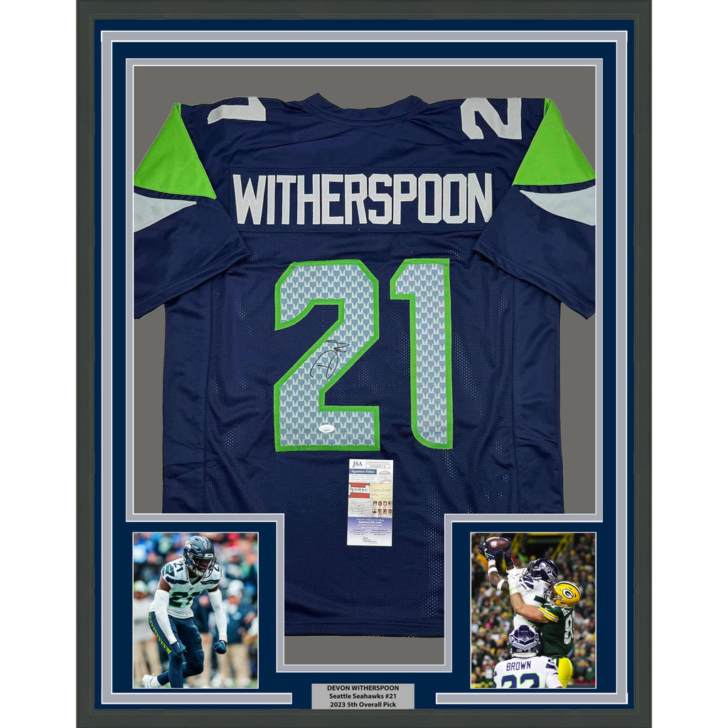 Framed Autographed/Signed Devon Witherspoon 35x39 Seattle Blue Jersey JSA COA The item is professionally framed and matted with two 5x7 photos, measures 35x39 inches and is ready to be hung in your man cave! Photo and matting requests can be made.