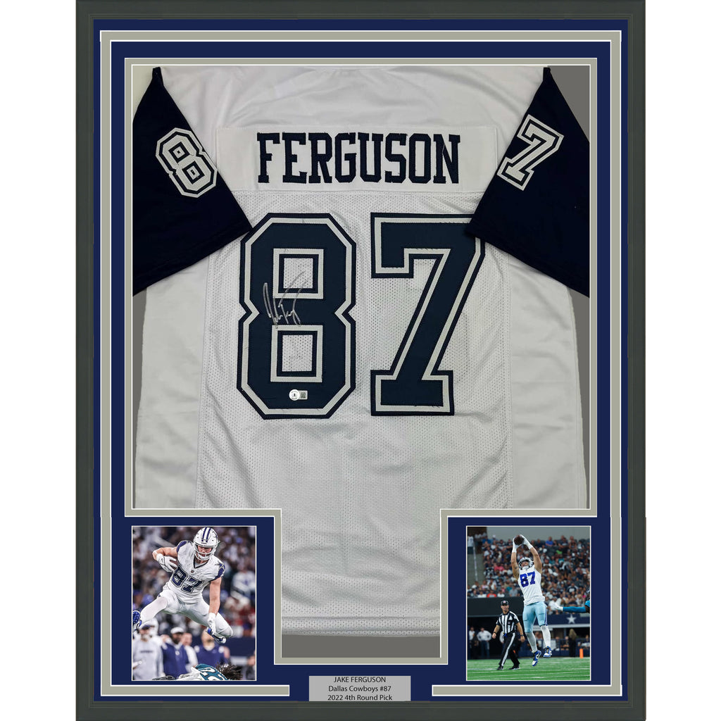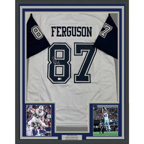 Framed Autographed/Signed Jake Ferguson 35x39 Dallas White CR Jersey Beckett COA The item is professionally framed and matted with two 5x7 photos, measures 35x39 inches and is ready to be hung in your man cave! Photo and matting requests can be made.