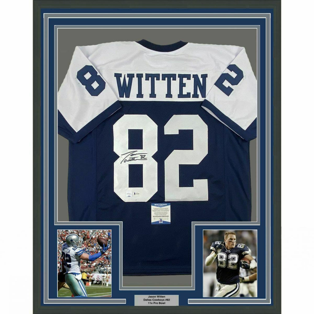 FRAMED Autographed/Signed JASON WITTEN 33x42 Dallas Thanksgiving Jersey BAS COA The item is professionally framed & matted with two 8x10 photos, measures 33"x42" and is ready to be hung in your man cave! NOTE: COA card will be mounted on the back of the frame, not inside it on top of the jersey as seen in the picture.