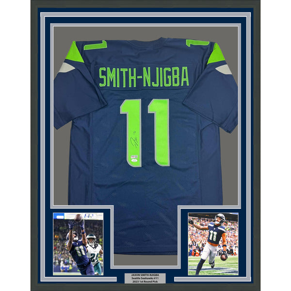 Framed Autographed/Signed Jaxon Smith-Njigba 35x39 Seattle Blue Jersey BAS COA The item is professionally framed and matted with two 5x7 photos, measures 35x39 inches and is ready to be hung in your man cave! Photo and matting requests can be made.