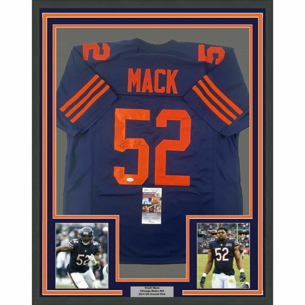 FRAMED Autographed/Signed KHALIL MACK 33x42 Chicago Retro Blue Jersey JSA COA The item is professionally framed & matted with two 8x10 photos, measures 33"x42" and is ready to be hung in your man cave! NOTE: COA card will be mounted on the back of the frame, not inside it on top of the jersey as seen in the picture. Please allow up to 5 business days for the item to be framed, packaged safely, and picked up by UPS. Photo and matting requests can be made.
