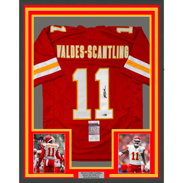 Framed Autographed/Signed Marquez Valdes-Scantling 33x42 Red Jersey JSA COA The item is professionally framed and matted with two 5x7 photos, measures 35 inches by 39 inches and is ready to be hung in your man cave! Photo and matting requests can be made.