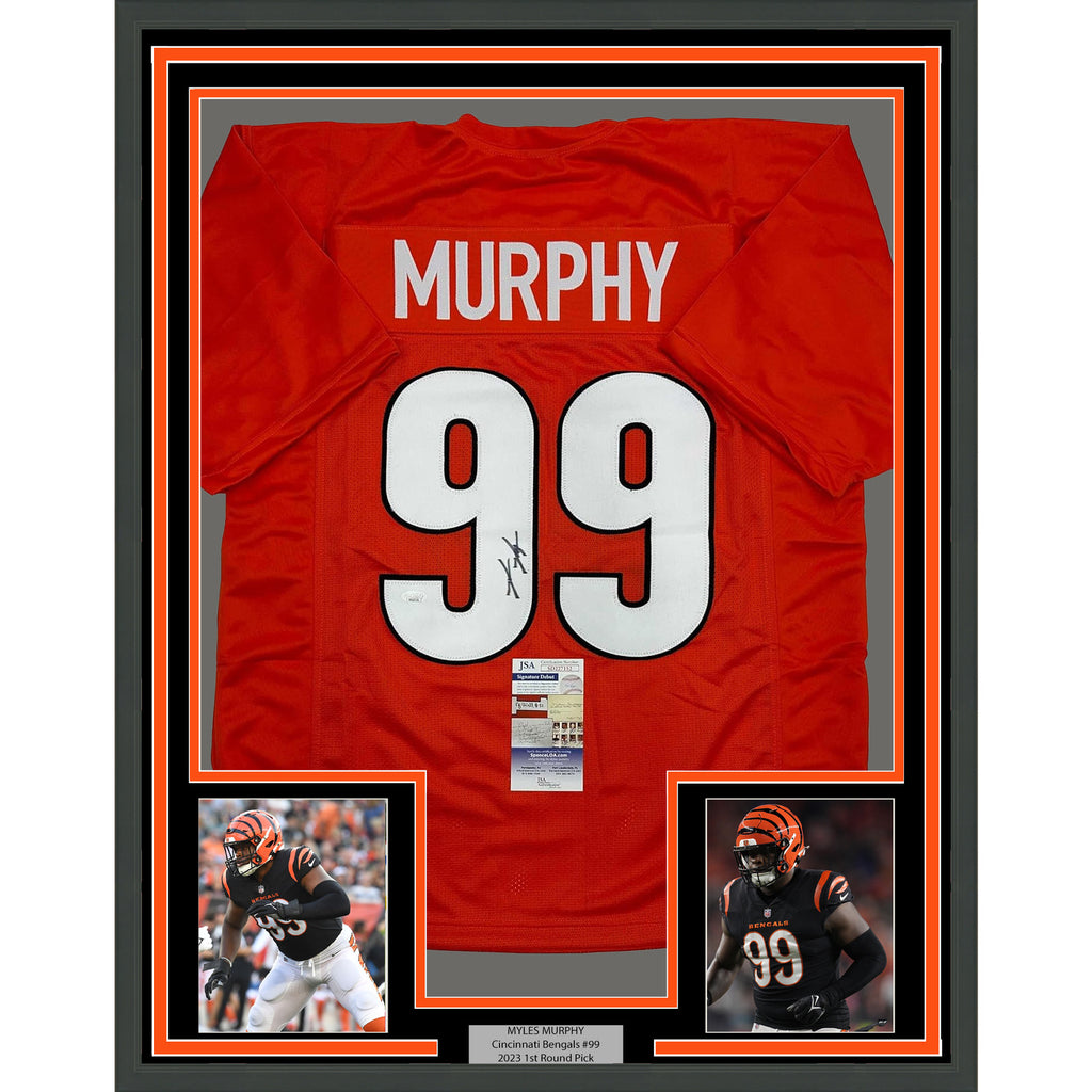 Framed Autographed/Signed Myles Murphy 35x39 Cincinnati Orange Jersey JSA COA The item is professionally framed and matted with two 5x7 photos, measures 35x39 inches and is ready to be hung in your man cave! Photo and matting requests can be made.