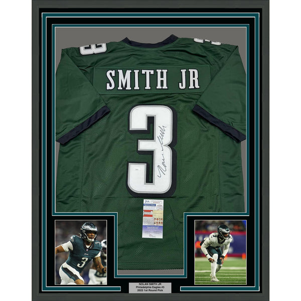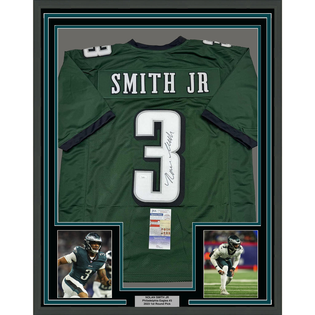 Framed Autographed/Signed Nolan Smith Jr 35x39 Philadelphia Green Jersey JSA COA The item is professionally framed and matted with two 5x7 photos, measures 35x39 inches and is ready to be hung in your man cave! Photo and matting requests can be made.