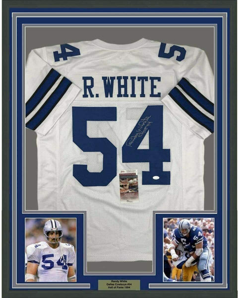 Framed Autographed/Signed Randy White HOF 94 33x42 Dallas White Jersey JSA COA The item is professionally framed & matted with two 8x10 photos, measures 33"x42" and is ready to be hung in your man cave! NOTE: COA card will be mounted on the back of the frame, not inside it on top of the jersey as seen in the picture.