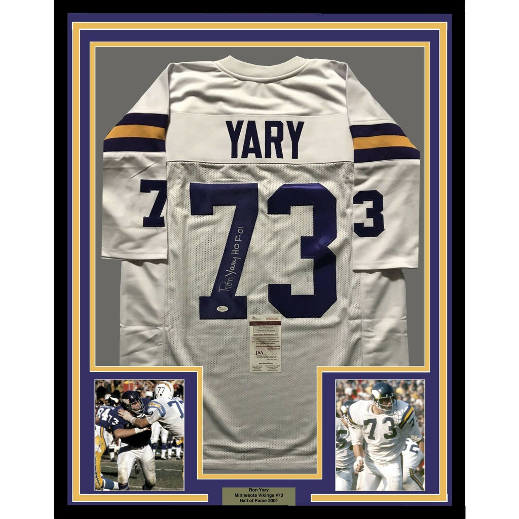 FRAMED Autographed/Signed RON YARY HOF 01 33x42 Minnesota White Jersey JSA COA The item is professionally framed & matted with two 8x10 photos, measures 33"x42" and is ready to be hung in your man cave! NOTE: COA card will be mounted on the back of the frame, not inside it on top of the jersey as seen in the picture. Photo and matting requests can be made.
