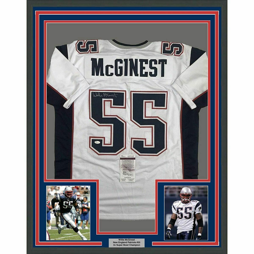 FRAMED Autographed/Signed WILLIE MCGINEST 33x42 New England White Jersey JSA COA The item is professionally framed & matted with two 8x10 photos, measures 33"x42" and is ready to be hung in your man cave! NOTE: COA card will be mounted on the back of the frame, not inside it on top of the jersey as seen in the picture.