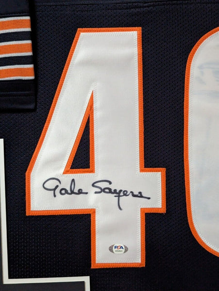 Custom Framed Gale Sayers hand signed Chicago Bears style custom jersey.PSA COAThe authentication is from PSA. This signature is WITNESSED by a representative of PSA! 100% AUTHENTIC!!! The jersey has fully stitched numbers on the front and back. It is a great item and a must for all great sports fans!This item is professionally framed, it measures 32"x40" inside , 42"x34" outside , using UV protective Acrylic glass for safe keeping and safe transport, team color matting, black moulding and hanging hooks on the back. All additional items in frame seen in pictures included. 100% ready to hang in your fan cave.