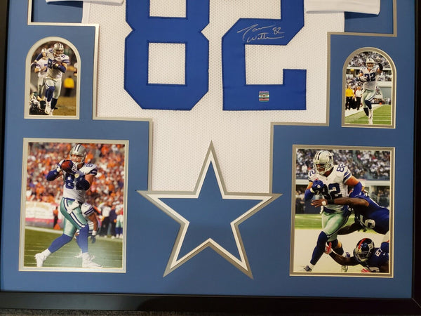 Framed Jason Witten signed Dallas Cowboys style Custom Jersey. JSA Hologram and COA The authentication is from JSA. This signature is authenticated by a representative of JSA! 100% AUTHENTIC!!! The jersey has fully stitched numbers on the front and back. No tags or logos. This is not an official NFL jersey but it is very high quality. It is a great item and a must for all great sports fans! This item is professionally framed, it measures 32"x40" inside , 42"x34" outside , using UV protective Acrylic glass for safe keeping and safe transport, team color matting, black moulding and hanging hooks on the back. All additional items in frame seen in pictures included. 100% ready to hang in your fan cave.