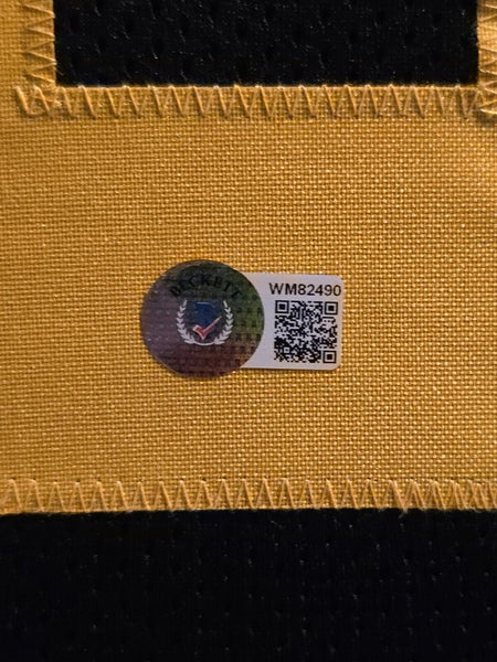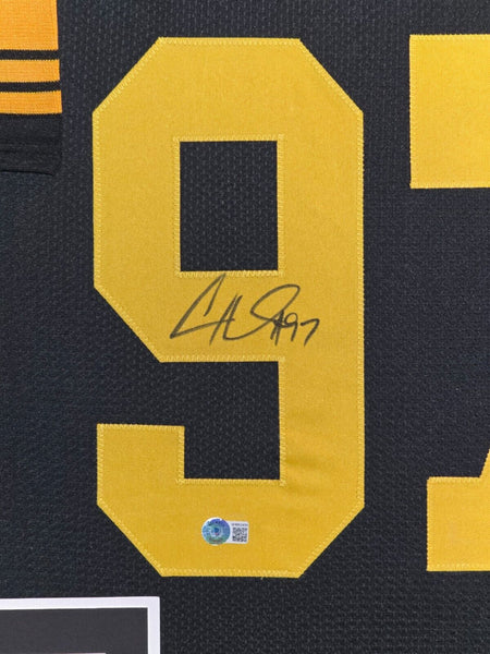Custom Framed Cam Heyward signed Pittsburgh Steelers style custom jersey.Beckett HologramThe authentication is from Beckett. This signature is WITNESSED by a representative of Beckett! 100% AUTHENTIC!!! The jersey has fully stitched numbers on the front and back. It is a great item and a must for all great sports fans!This item is professionally framed, it measures 32"x40" inside , 42"x34" outside , using UV protective Acrylic glass for safe keeping and safe transport, team color matting, black moulding and hanging hooks on the back. All additional items in frame seen in pictures included. 100% ready to hang in your fan cave.