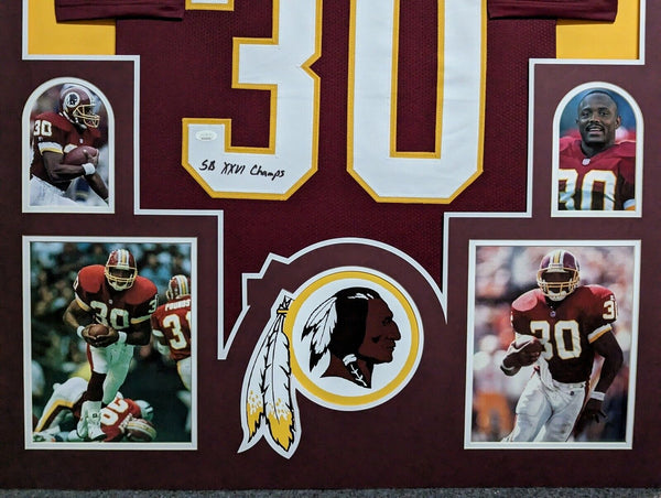 Custom Framed Brian Mitchell hand signed Washington football style custom jersey."SB XXVI Champs" InscribedJSA COAThe authentication is from JSA. This signature is WITNESSED by a representative of JSA! 100% AUTHENTIC!!! The jersey has fully stitched numbers on the front and back. This item is professionally framed, it measures 32"x40" inside , 42"x34" outside , using UV protective Acrylic glass for safe keeping and safe transport, team color matting, black moulding and hanging hooks on the back. All additional items in frame seen in pictures included. 100% ready to hang in your fan cave.