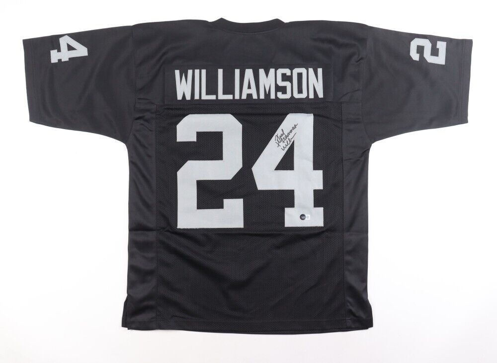Custom on-field style jersey. Everything is sewn on, size Adult XL. Has been hand-signed and inscribed by Fred Williamson.The autograph includes an official Beckett Authentication Services serially numbered hologram and QR Code Card for authenticity purposes.Authentication: Beckett Hologram
