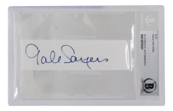 Featured is a Gale Sayers Chicago Bears slabbed signature cut. This cut has been signed by Gale Sayers and slabbed and authenticated by Beckett authentication services. This item would make a great addition to any sports memorabilia collection.. SPECIFICATIONS Autographed By: Team: Chicago Bears Sport: Football Authentication: Beckett Grading Services