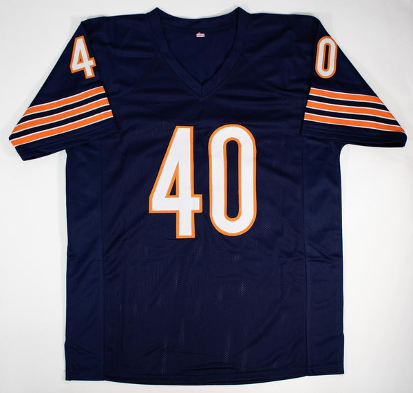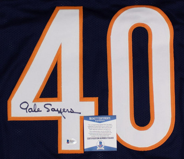 Custom on-field style jersey. Everything is sewn on, size XL. This autographed jersey has been personally hand-signed by Gale Sayers of the Chicago Bears.This autograph is certified by Beckett Authentication Services (BAS) Witness Certification. That means that a Beckett representative was present when this item was signed. It comes with the numbered hologram and matching Certificate of Authenticity.Custom on-field style jerseys are a more affordable option for autograph seekers. These jerseys do not have any brand name or tags and are made in the Philippines. They feature stitched on names and numbers and are made to look very similar to the on-field jerseys that the players wear. These custom jerseys are very commonly used in the memorabilia industry.