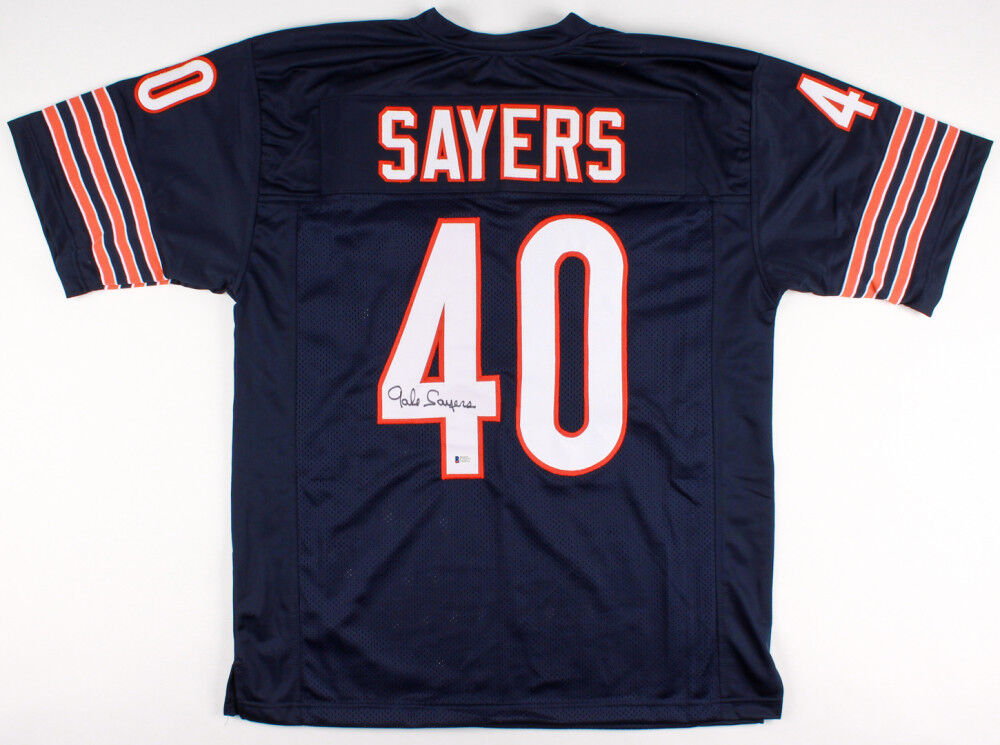 Custom on-field style jersey. Everything is sewn on, size XL. Hand-signed in black felt-tip pen by Gale Sayers. (HOF) The lot / autograph(s) includes an official Beckett Authentication Services serially numbered hologram and matching COA for authenticity purposes.Authentication: Beckett COA