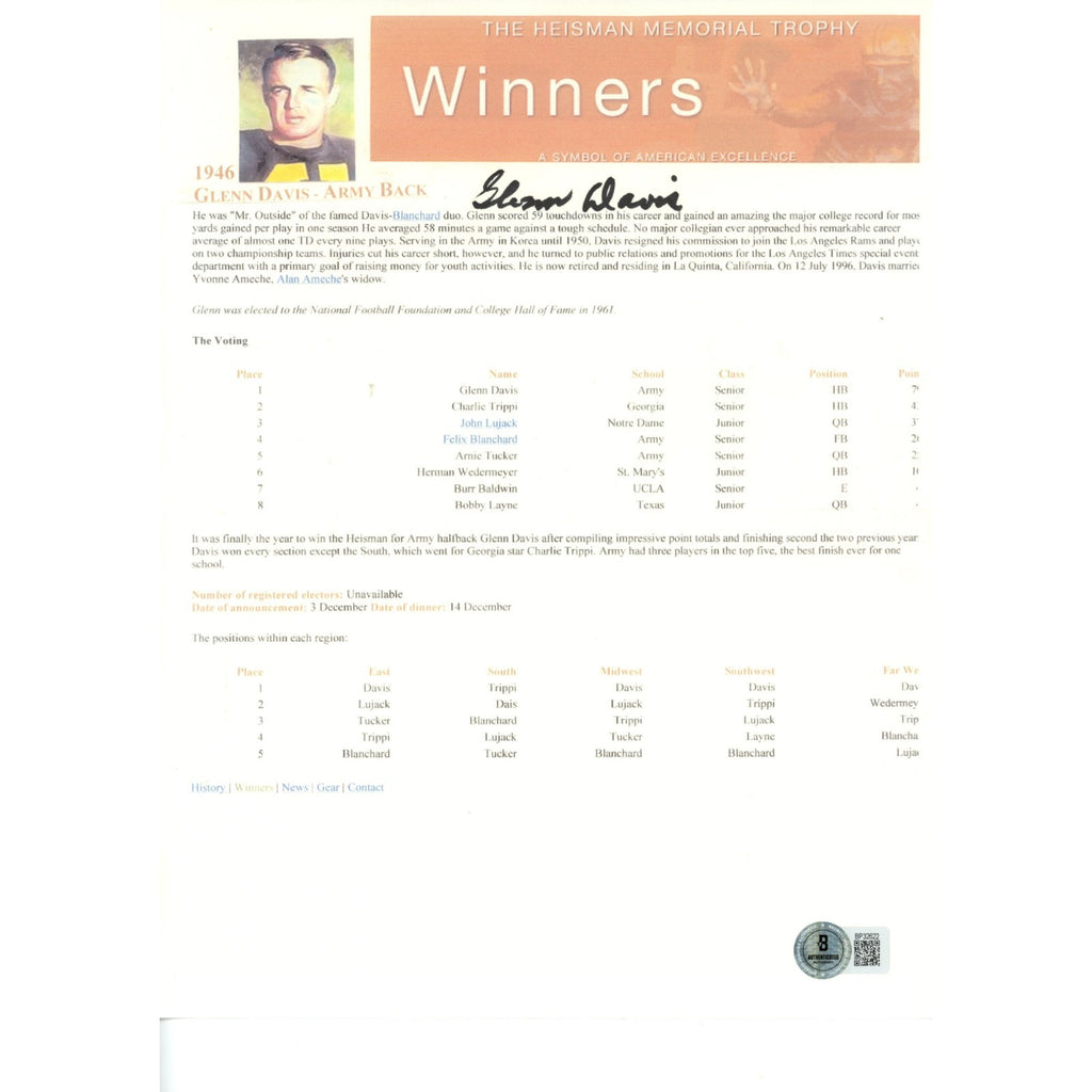 The number in the listing title is just an inventory sku for our records and is not the authentication number. The item pictured is the exact item you will receive, please see photos for condition. This is an Army Black Knights 1946 Heisman Biography paper print out that was personally autographed by Glenn Davis. Includes a certificate of authenticity from James Spence Authentication (JSA) and Denver Autographs.FREE SHIPPING within the USA on orders over $10!