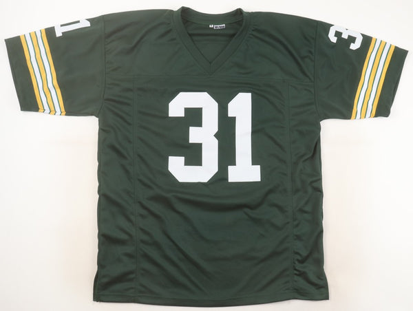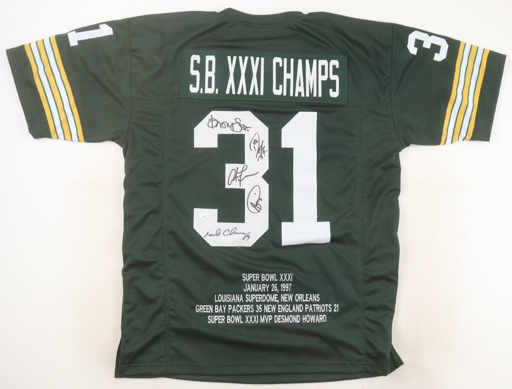 Custom jersey. Everything is sewn on, size XL. Hand-signed by Dorsey Levens, Don Beebe, Antonio Freeman, Andre Rison and Mark Chmura. Highlights have been custom stitched onto the back of the jersey below the reverse numbers.The autograph(s) includes an official James Spence Authentication (JSA) hologram and QR Code card for authenticity purposes.Authentication: JSA Hologram with QR Code card