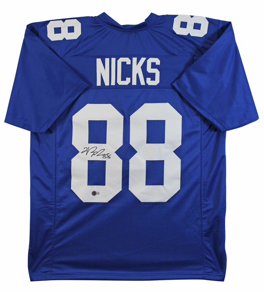This Autographed Blue Pro Style Jersey has been Personally Signed by Hakeem Nicks of the New York Giants. This item is 100% Authentic to include a hologram by Beckett Authentication Services. This item will come with an affixed Beckett Authentication Services (BAS) authentication sticker, which includes a scannable QR code to verify authenticity. Please note that Beckett no longer provides serial-numbered COA cards, and the attached BAS sticker will serve as the complete authentication for this item. We conducted an autograph signing with Hakeem Nicks where multiples of the same item were signed. While the photographs are representative of this item, the size, placement and strength of the signature may vary. Each item is hand signed, therefore, each autograph is unique. This item can be verified through BAS. This is a X-Large sized Jersey.