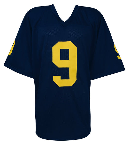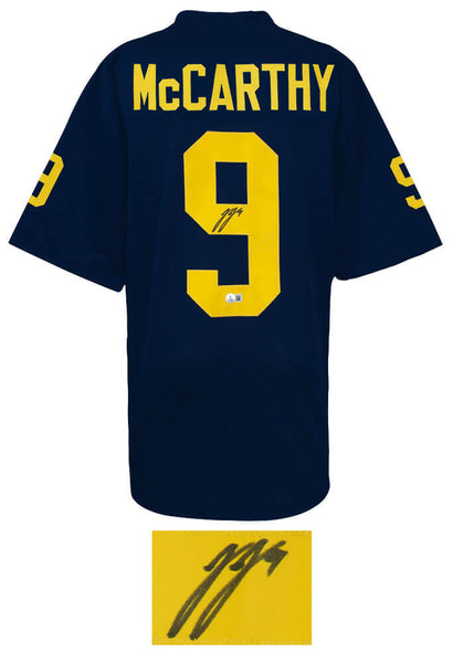 J.J. McCarthy signed navy custom college football jersey. Item comes with a Beckett Authentication tamper evident numbered sticker and matching Certificate of Authenticity which can be verified online.