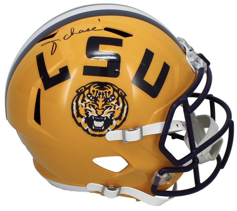 This full size replica speed helmet has been personally hand-signed by Ja'Marr Chase. It is officially licensed by the NCAA and comes with an individually numbered, tamper-evident hologram from Fanatics Authentic. To ensure authenticity, the hologram can be reviewed online. This process helps to ensure that the product purchased is authentic and eliminates any possibility of duplication or fraud.