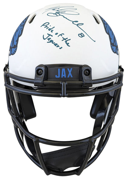 This Autographed Alternate Lunar Riddell Authentic Full Size Speed Proline Helmet with the inscription of "10k Rush Club (Taylor), Pride of the Jaguars (Brunell), HOF 22 (Boselli)" has been Personally Signed by Fred Taylor, Mark Brunell & Tony Boselli of the Jacksonville Jaguars. This item is 100% Authentic to include a hologram by Beckett Authentication Services. This item will come with an affixed Beckett Authentication Services (BAS) authentication sticker, which includes a scannable QR code to verify authenticity. Please note that Beckett no longer provides serial-numbered COA cards, and the attached BAS sticker will serve as the complete authentication for this item. This is a BAS Witnessed Protection Program item which means a Beckett Authentication Service representative was present when this item was being signed. We conducted an autograph signing with Fred Taylor, Mark Brunell & Tony Boselli where multiples of the same item were signed. While the photographs are representative of this item, the size, placement and strength of the signature may vary. Each item is hand signed, therefore, each autograph is unique. This item can be verified through BAS Witnessed.