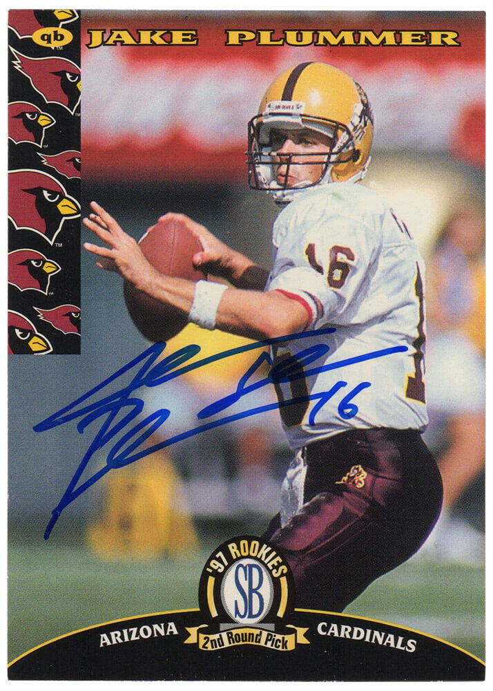 Jake Plummer signed Arizona Cardinals 1997 SB 2nd round pick rookie football trading card #1 with 'Snake' inscription. Item comes with a Schwartz Sports Memorabilia tamper-proof numbered hologram (on back of physical card) and Certificate of Authenticity which can be verified online.