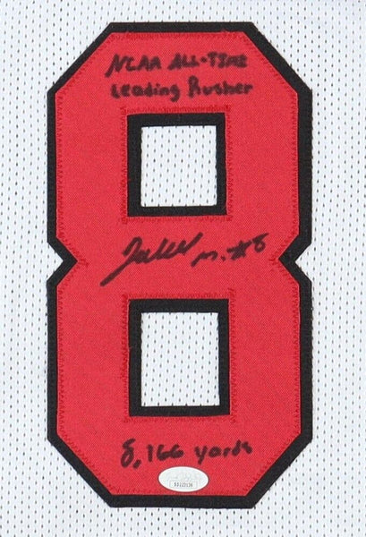Custom on-field style jersey with everything sewn on, size adult XL. Hand-signed and inscribed by Jaleel McLaughlin.The autograph(s) includes an official James Spence Authentication (JSA) "Signature Debut" hologram. "Signature Debut" is the autographed memorabilia equivalent to a rookie card. The JSA definition of a "Signature Debut" is as follows: "Any item that is autographed and received by JSA prior to the last game of the signer's official rookie season.Authentication: JSA Hologram