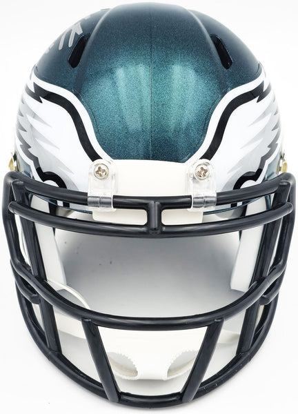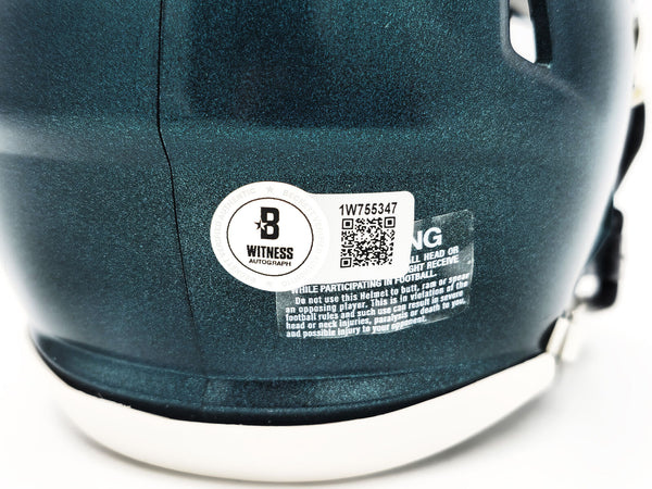 This is a Philadelphia Eagles Green Speed Mini Helmet that has been hand signed by Jalen Carter. This item has been witnessed and certified authentic by Beckett Authentication (BAS) and comes with their tamper-proof witness sticker.