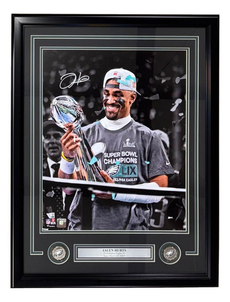 Featured is a Jalen Hurts signed 16x20 Philadelphia Eagles photo. This photo was hand signed by Hurts and comes with the Fanatics hologram and certificate of authenticity. This photo has been professionally framed and matted and is approximately 22x27. This item would make a great addition to any sports memorabilia collection.. SPECIFICATIONS Autographed By: Jalen Hurts Team: Philadelphia Eagles Sport: Football Authentication: Fanatics Authentic