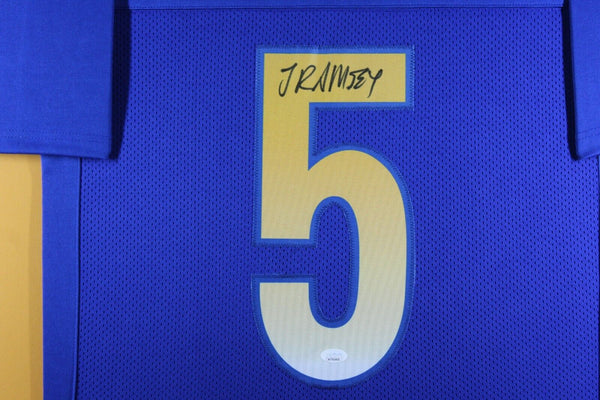 JALEN RAMSEY AUTOGRAPHED & PROFESSIONALLY FRAMED PRO-STYLE JERSEY(Occasionally our own stock pictures are used at times due to quantity of framing, all frames will look identical as the one pictured)Every framed autographed jersey is accompanied with a tamper-proof hologram on the signed part of the jersey from one of the main authenticators in the industry (JSA, Beckett, PSA, etc.) and can be verified on their corresponding websites to prove authenticity.THE FRAMED JERSEY MEASURES 35"x 44" & COMES WITH THE FOLLOWING:-UV Protected Acrylic-Triple Acid Free Team Colored Matting-2 High Quality 8"x10" Photos-Team Logo