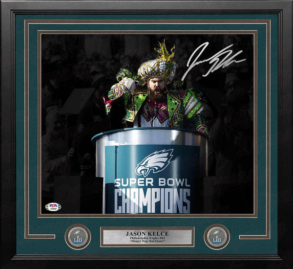 Signed picture of Eagles star Jason Kelce; authenticated by PSA This limited edition photo has been hand-signed by Philadelphia Eagles star Jason Kelce. Kelce made an incredible victory speech during the Eagles Super Bowl LII championship Parade while dressed in classic a Mummers outfit. It has been authenticated by PSA. Hand-Signed by Philadelphia Eagles star Jason KelceSignature is bold and clear on the photoAuthenticated with PSA serially numbered hologram and certificateFramed and matted photos are professional qualityIncludes Super Bowl LII championship medallions!Framed 16" x 20" photo measures 22" x 26"