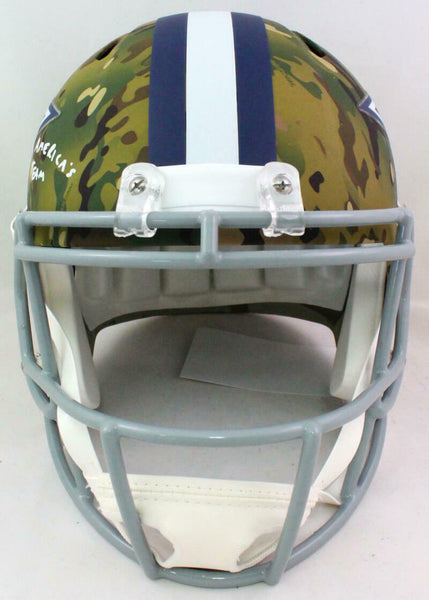 Jason Witten Autographed Dallas Cowboys Camo Speed F/S Helmet w/insc- Beckett W *White This is a Jason Witten of the Dallas Cowboys hand autographed Riddell Football full size camo speed replica helmet. This item has a Beckett Witnessed Authentication, which comes with a numbered sticker and a matching Beckett Certificate of Authenticity. You can view this item on the Beckett Authentication website and it shows when and where the item was signed. It was signed either at a public autograph appearance or a private signing. This is a stock photo of the item. Although you may not receive this exact item, the item you receive is virtually identical, brand new, and in great shape.